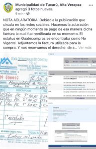 La municipalidad publicó una nota aclaratoria en su página de Facebook donde publicó la misma factura alterada y el concurso vigente, pero no el primer documento que originó la polémica. La municipalidad borró el post de la factura, donde también advertía que se reservaba «el derecho de tomar acciones contra quienes tergiversen la información».