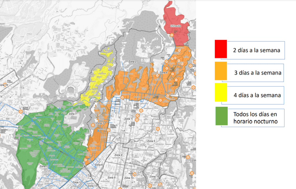 El mismo documento da cuenta que la planta Lo de Coy en Mixco que surte a cinco zonas, pero lo hace solo en horario nocturno y en al menos dos días a la semana.