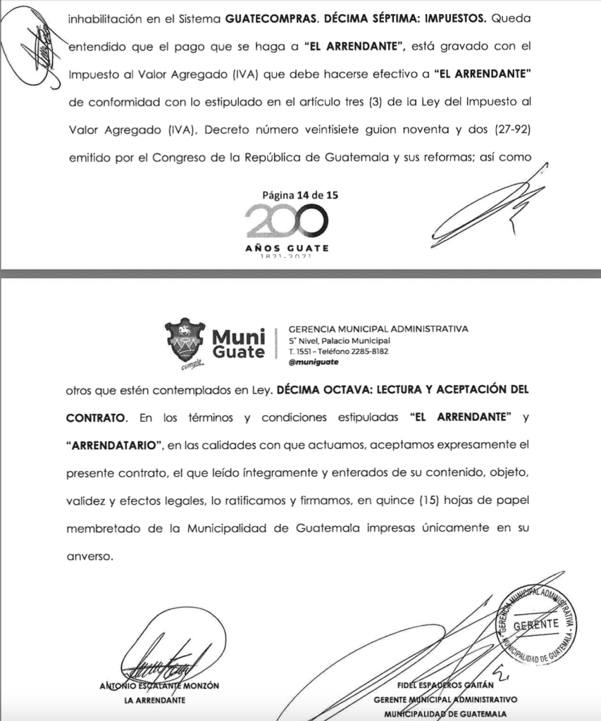 El primero se llevó a cabo el 26 de agosto de 2021 por un predio de 28 mil 382 metros cuadrados en San Antonio La Paz. El contrato fue firmado por 18 meses: del 1 de septiembre de 2021 al 28 febrero de 2023 por Q900 mil.