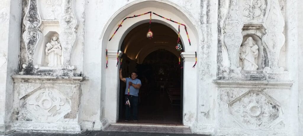 Víctor Hugo Cú abre la pesada puerta de más de 400 años de antigüedad que da al patio del pequeño convento que está en la cima de la ermita. Da los últimos retoques al catafalco de madera en donde se colocará una estructura de metal que sostendrá la imagen del Cristo de Esquipulas. “A las parroquias a dónde nos han mandado hemos dejado un Cristo Negro”, afirma con una sonrisa afable.