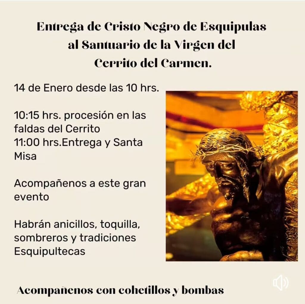 Un nuevo Cristo Negro de Esquipulas podrá apreciarse en el Santuario de la Virgen del Cerrito del Carmen. Este domingo 14 de enero, a partir de las 10:00 horas, en medio de toquillas, sombreros y tradiciones de Esquipulas se celebrará la entrega de la imagen a ese templo.