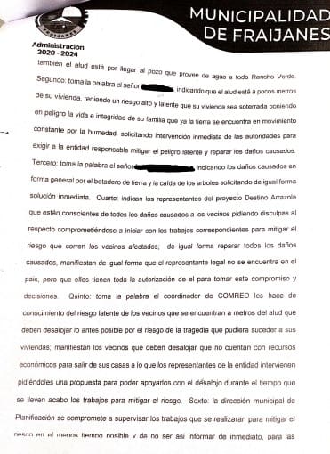 En el documento se lee cómo el personal de Destino Arrazola acepta su responsabilidad, ofrece disculpas y promete reparar el daño causado. Además, la Coordinadora Municipal para la Reducción de Desastres (Comred) dejó constancia del riesgo que corrían los pobladores por una posible avalancha y por lo tanto debían desalojar mientras la situación se resolvía.