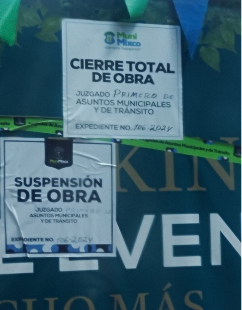 El Juzgado Primero de Asuntos Municipales y de Tránsito de Mixco, ordenó el cierre total de la obra. Sellaron las puertas del proyecto en noviembre de 2024.