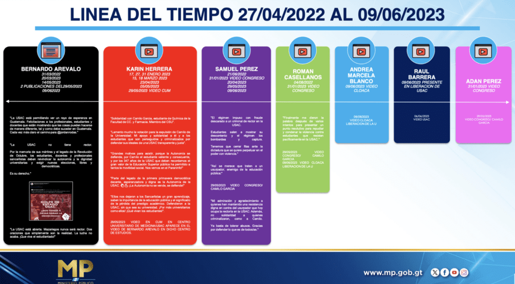Sánchez indicó que la toma de la universidad se utilizó presuntamente para impulsar las candidaturas a elección popular de Karin Herrera y Bernardo Arévalo, el binomio presidencial electo para la siguiente administración, además de aspirantes a diputaciones. A estas personas se les señala por depredación de bienes culturales en forma continuada, asociación ilícita y tráfico de influencias.