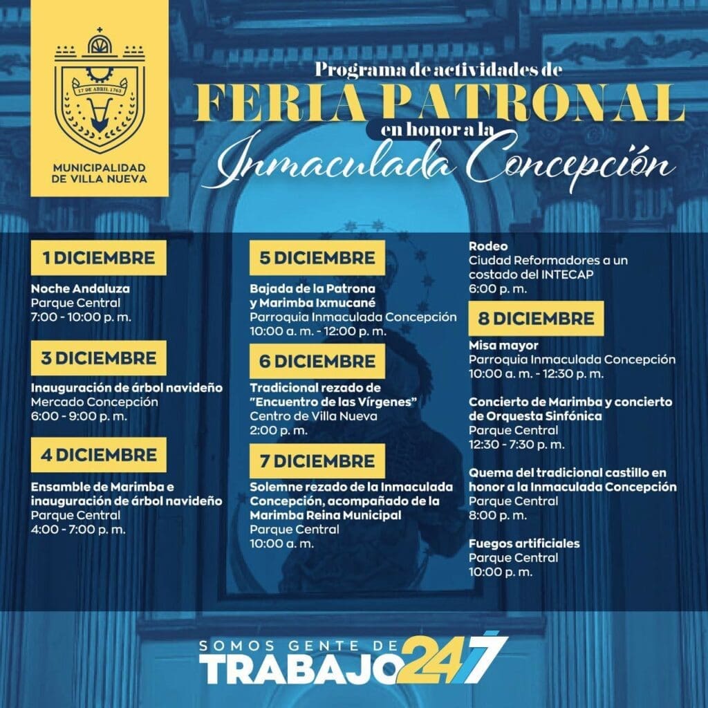 La fiesta patronal de Villa Nueva, Guatemala, se celebra cada 8 de diciembre en honor a la inmaculada Virgen de la Concepción. Es comida tradicional, luces y fuegos artificiales y transmisión de sus actividades por televisión abierta, que al menos este año costará Q85 mil.